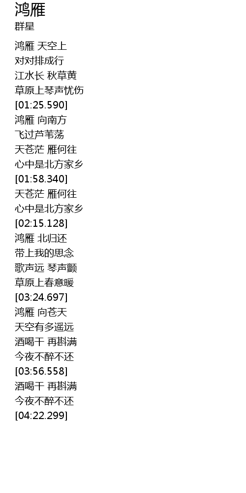 | [01:26.890] | hóng yàn xiàng nán fāng |