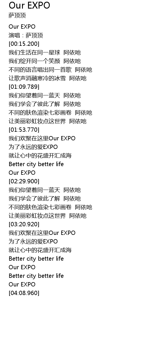 | [01:56.430] | wo men huan ju zai zhe li Our EXPO |