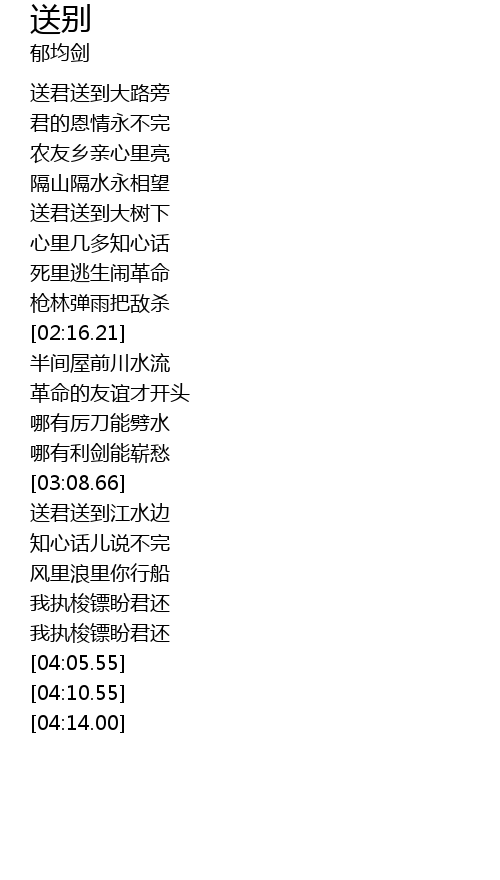 | [03:14.62] | sòng jūn sòng dào jiāng shuǐ biān |