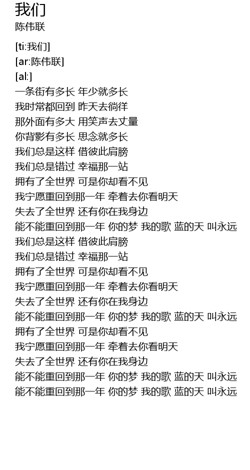 | [01:28.63] | 能不能重回到那一年 你的梦 我的歌 蓝的天 叫永远 |