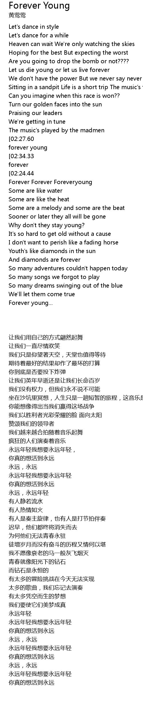 | [02:41.93][02:27.60][02:15.59][01:12.60][00:58.38] | Forever young I want to be forever young |