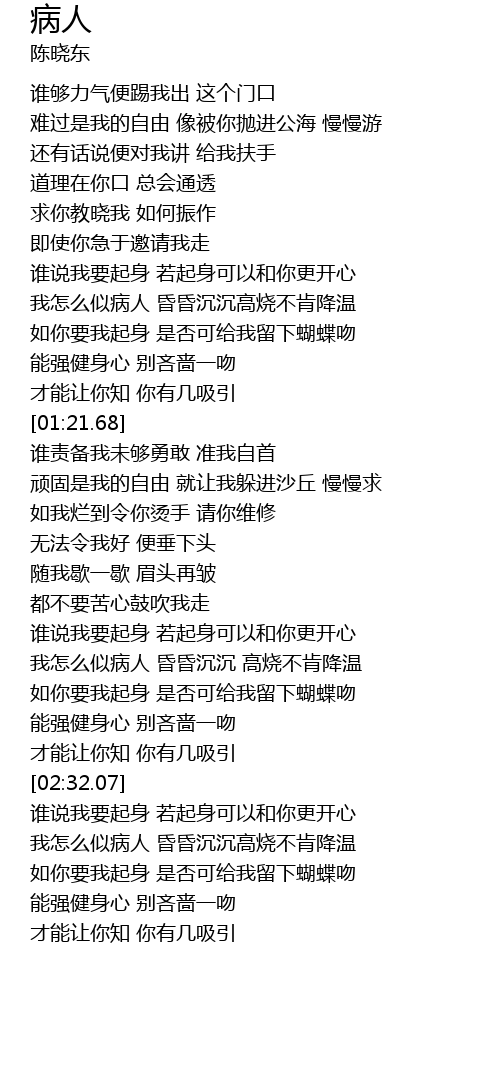 | [02:05.75] | wǒ zěn me shì bìng rén hūn hūn chén chén gāo shāo bù kěn jiàng wēn |