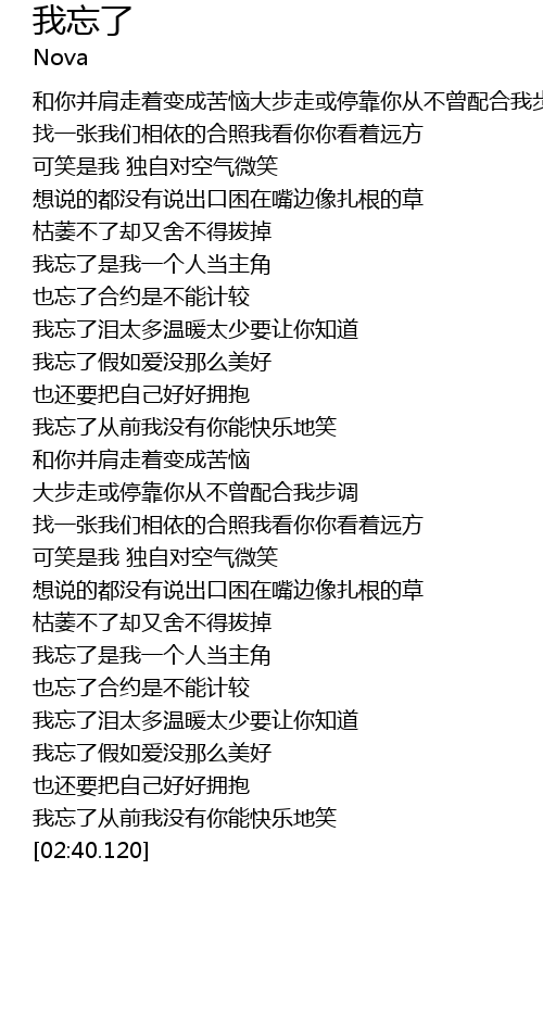 | [02:18.820] | 我忘了泪太多温暖太少要让你知道 |