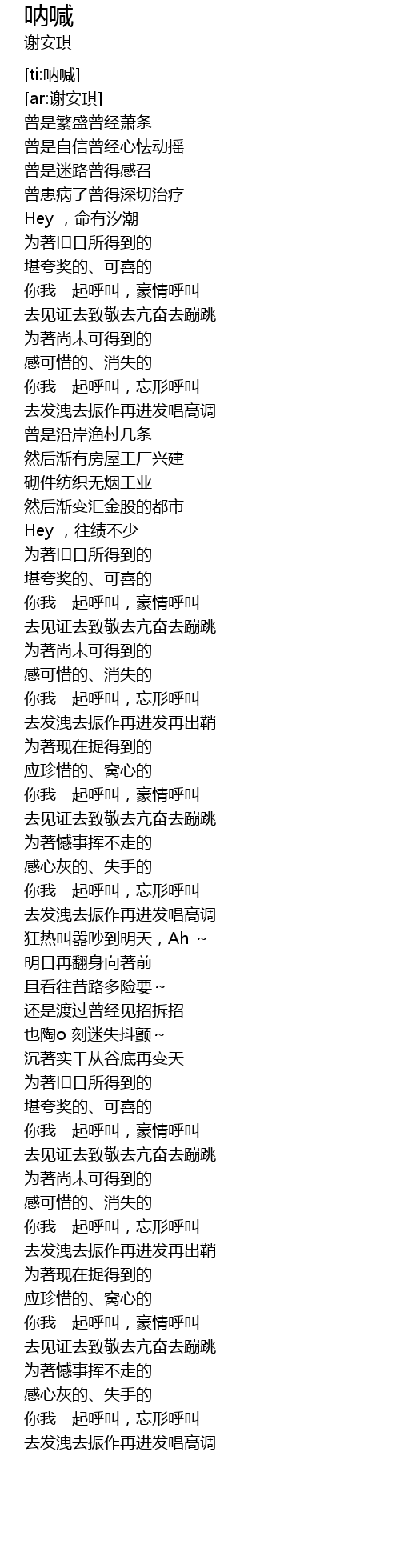 | [02:17.261] | nǐ wǒ yì qǐ hū jiào, háo qíng hū jiào |
