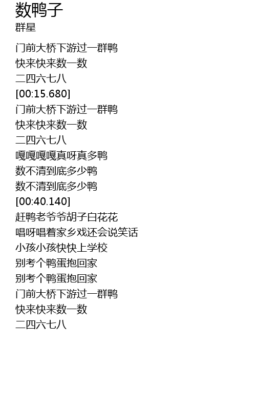 | [01:07.350] | 门前大桥下游过一群鸭 |