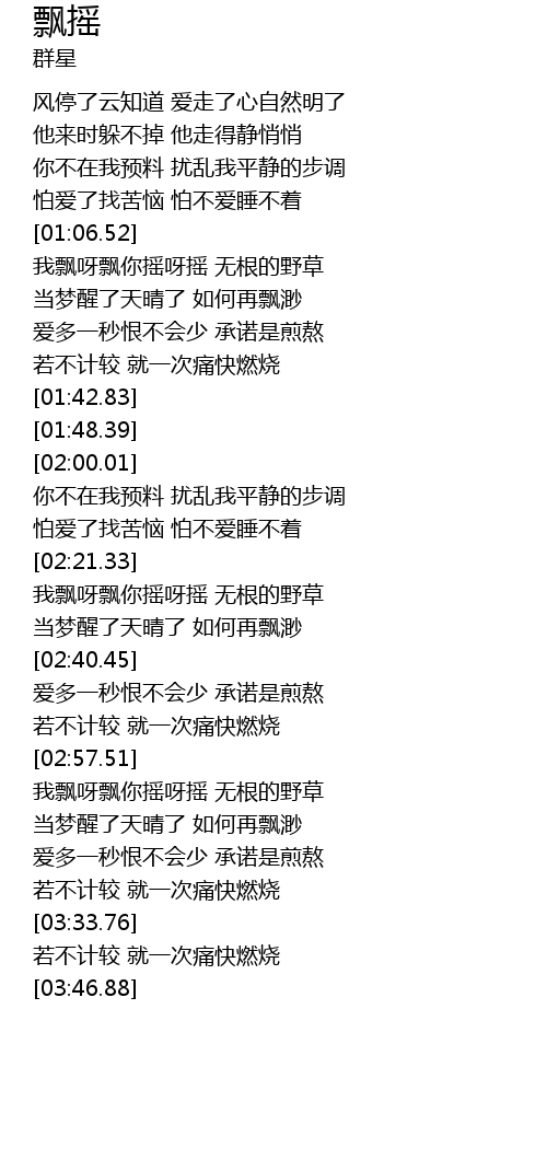 | [02:22.89] | 我飘呀飘你摇呀摇 无根的野草 |