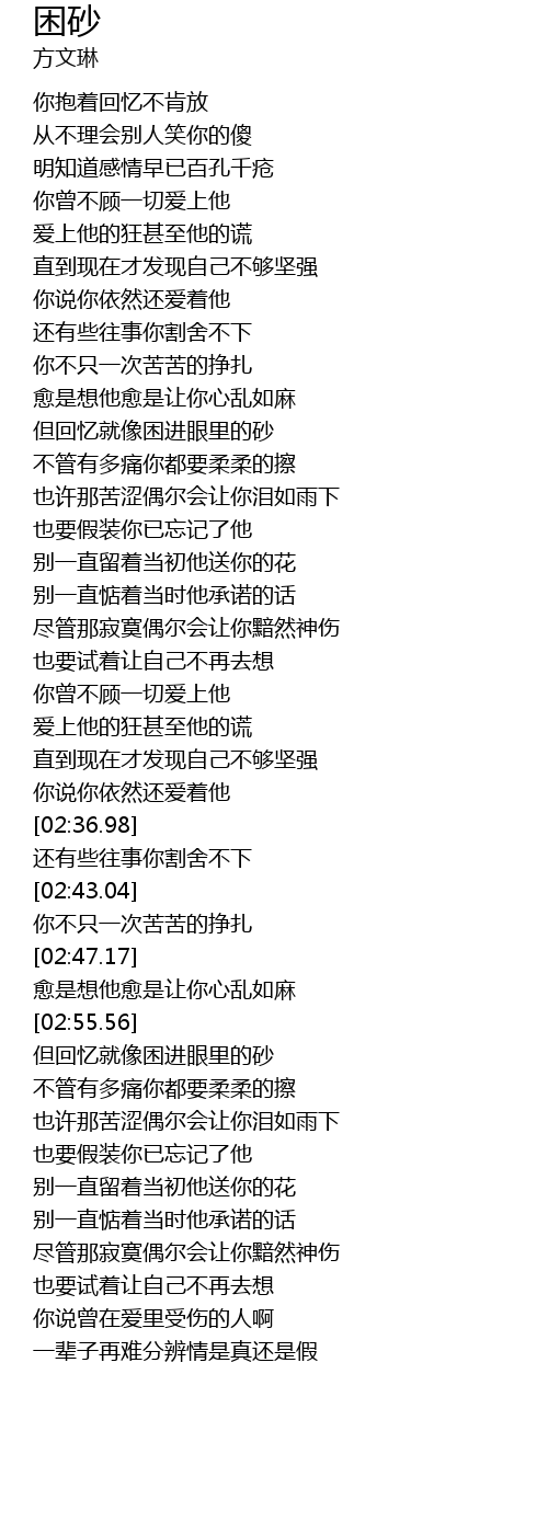 | [02:57.26] | 但回忆就像困进眼里的砂 |