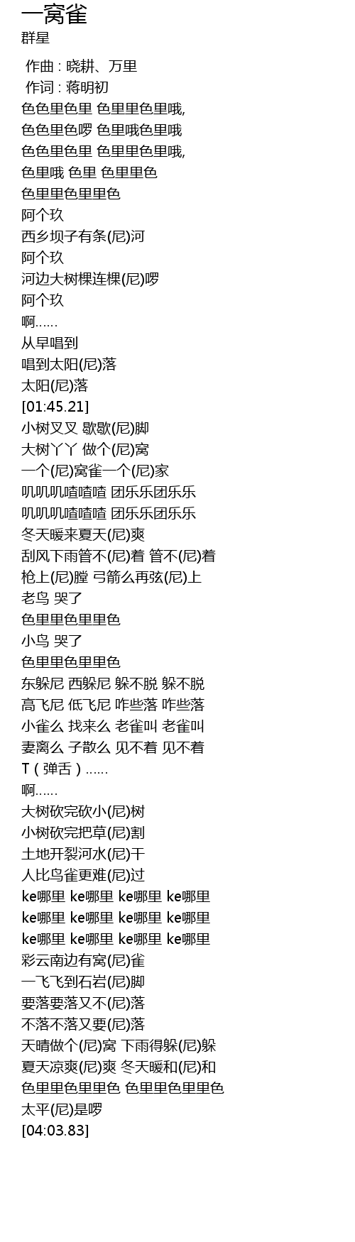 | [01:55.16] | 一个(尼)窝雀一个(尼)家 |