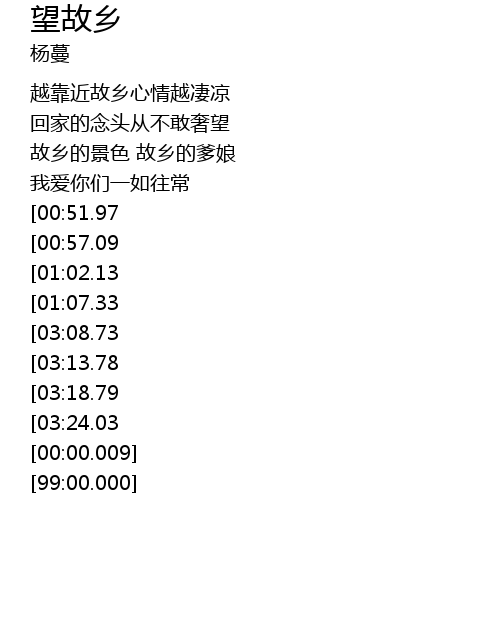 | [00:36.22] | 故乡的景色 故乡的爹娘 |