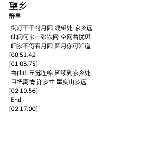 | [00:13.70] | 街灯千千衬月圆 凝望处 家乡远 |