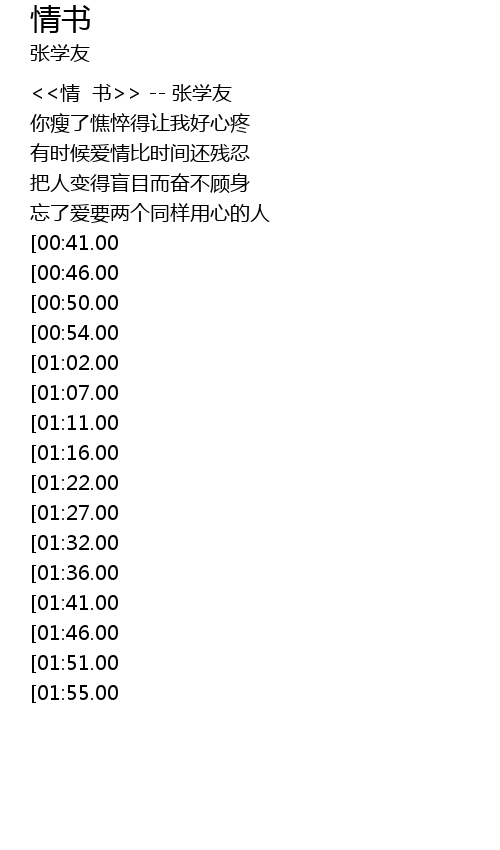 | [00:01.00] | <<情 书>> -- 张学友 |