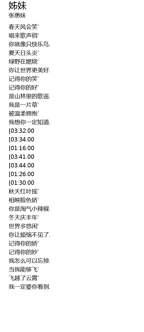 | [03:51.00][03:32.00][03:13.00][02:25.00][01:09.00] | 你是我的姊妹' |