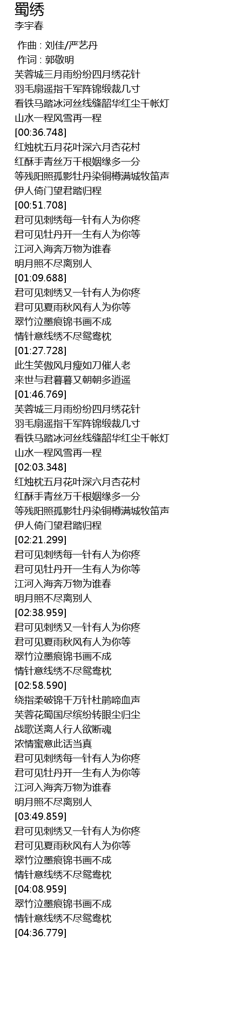 | [00:55.190] | 君可见刺绣每一针有人为你疼 |