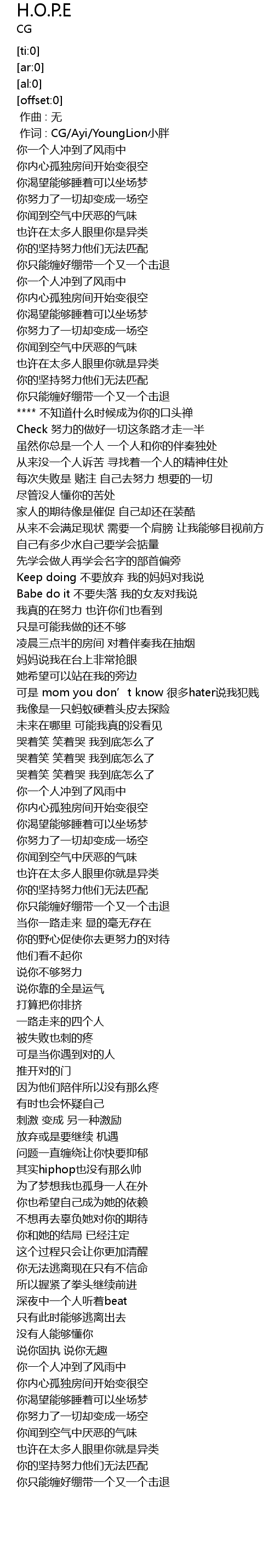 | [00:01.000] | 作词 : CG/Ayi/YoungLion小胖 |