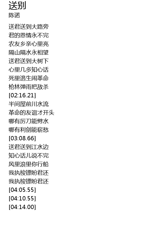 | [03:14.62] | sòng jūn sòng dào jiāng shuǐ biān |