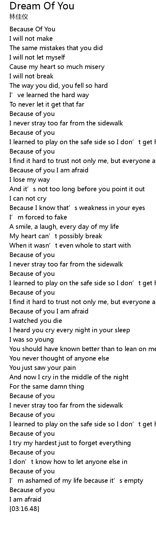 | [01:59.27] | Because of you I am afraid |