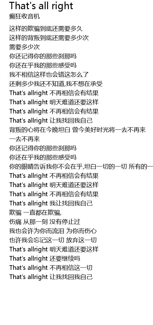 | That' s allright ràng wǒ zhǎo huí wǒ zì jǐ |