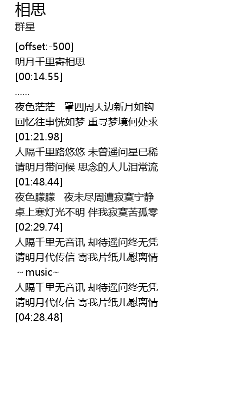 | [04:14.88] | 请明月代传信 寄我片纸儿慰离情 |