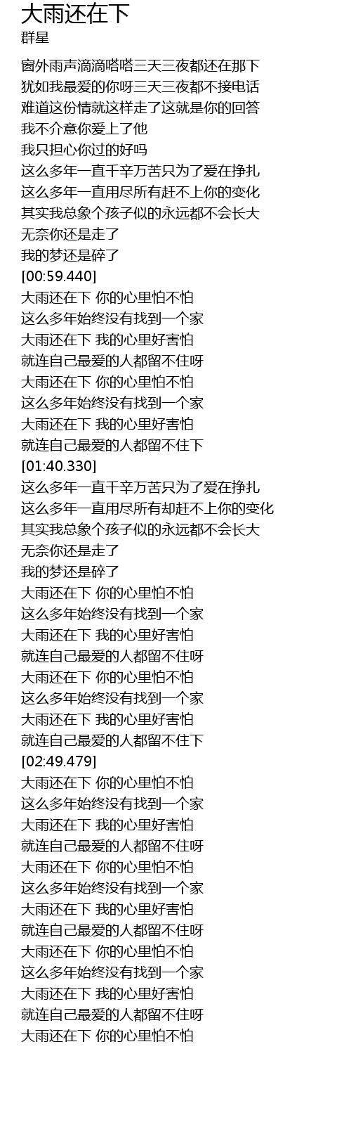 | [04:00.689] | 大雨还在下 我的心里好害怕 |