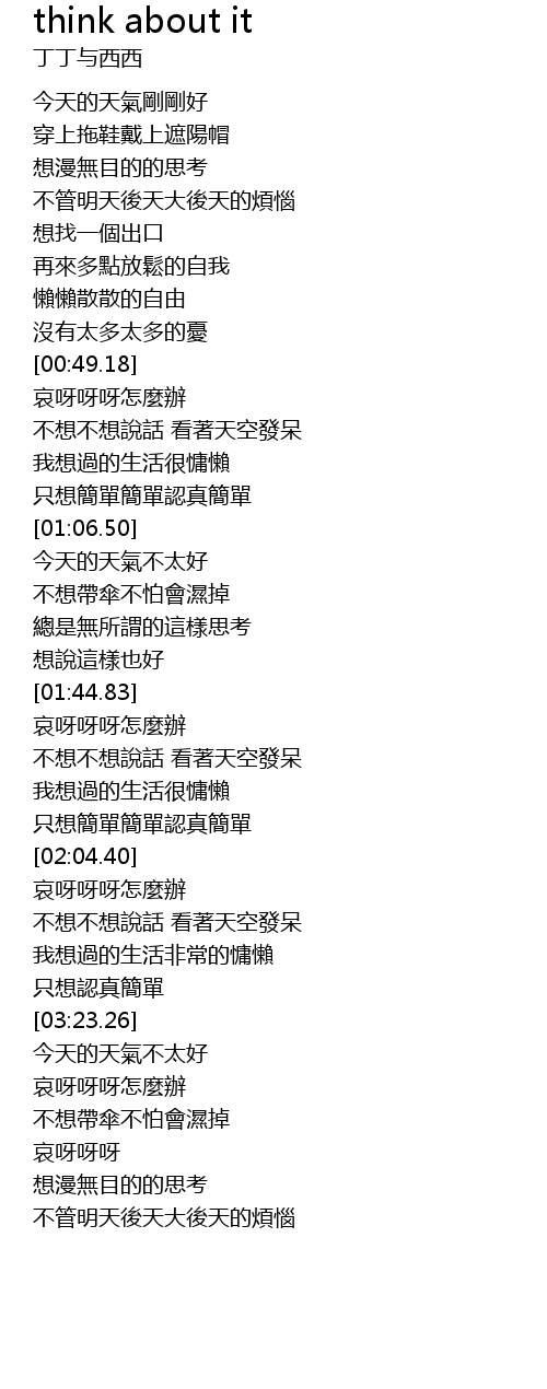 | [01:38.35] | 總是無所謂的這樣思考 |