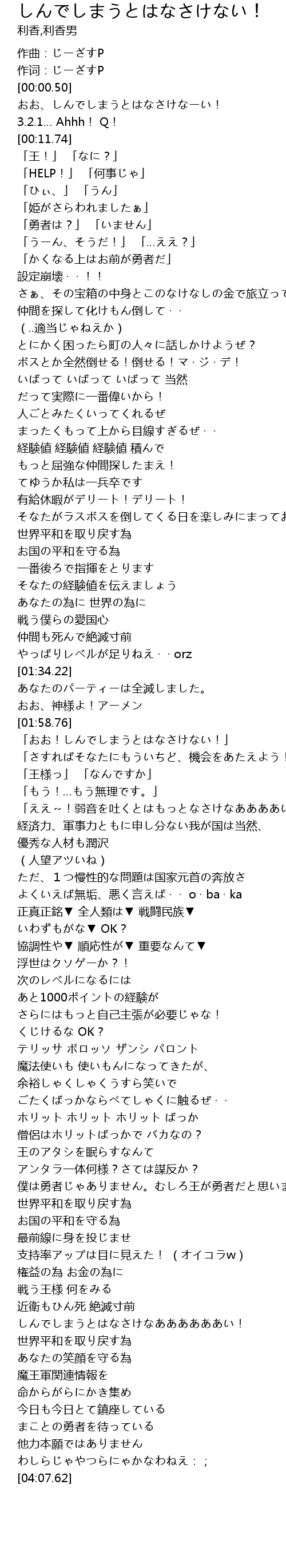 | [03:40.87] | しんでしまうとはなさけなああああああい! |