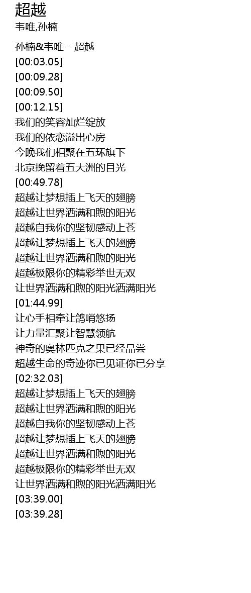 | [00:01.13] | 孙楠&韦唯 - 超越 |