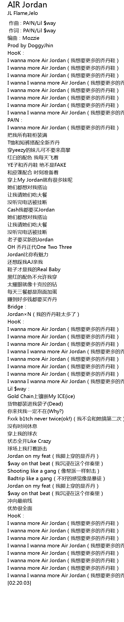 | [00:13.21] | I wanna more Air Jordan wǒ xiǎng yào gèng duō de qiáo dān xié |