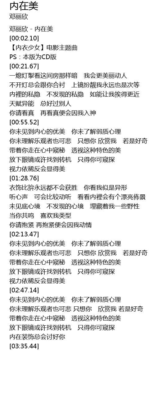 | [00:01.19] | 邓丽欣 - 内在美 |
