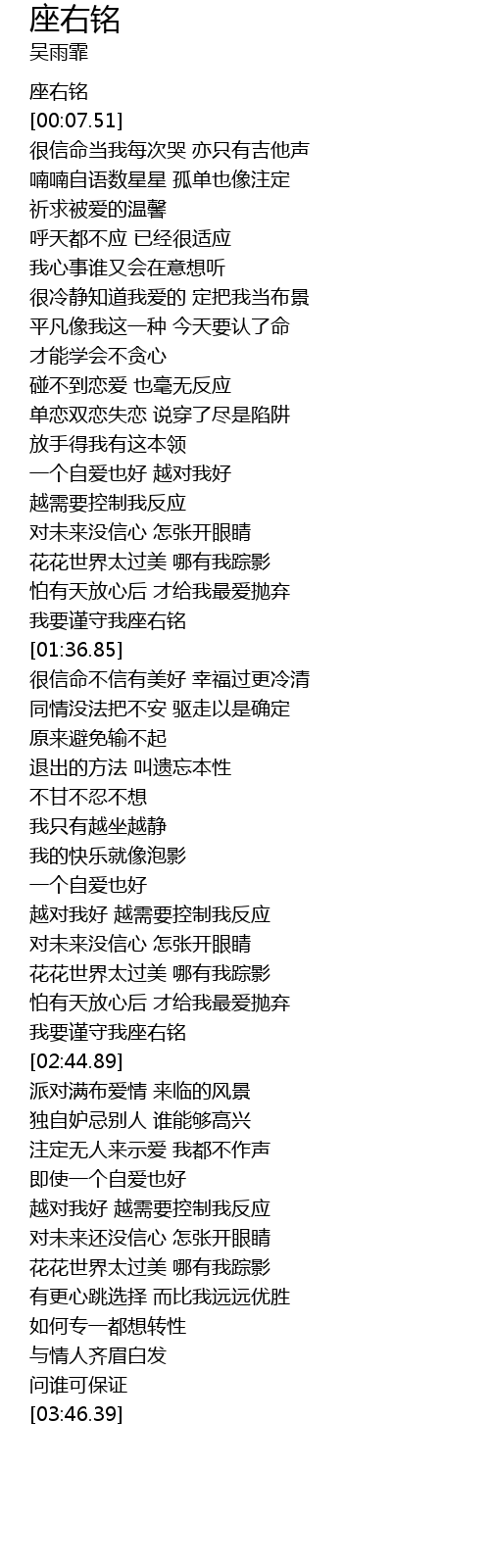 | [00:13.71] | hen xin ming dang wo mei ci ku yi zhi you ji ta sheng |