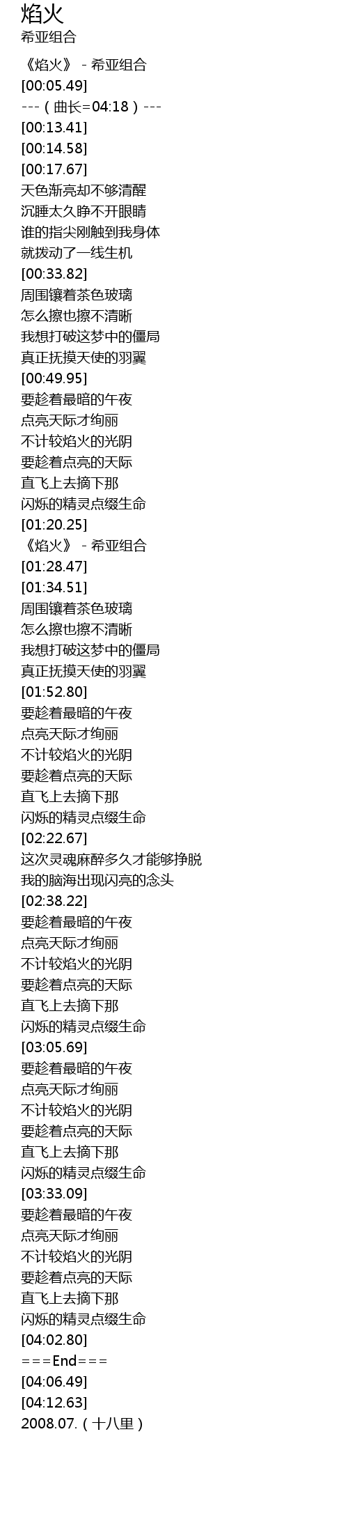 | [00:00.00] | 《焰火》 - 希亚组合 |