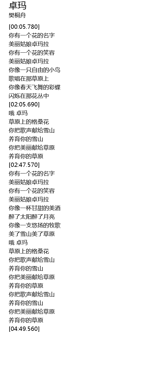 | [01:44.980] | 美丽姑娘卓玛拉 |
