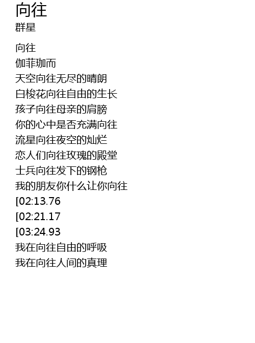 | [03:54.75][03:24.93][02:28.66] | 向往着 向往着 自由的歌唱 |