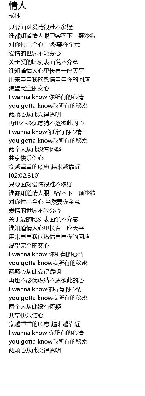 | [03:40.460] | I wanna know ni suo you de xin qing |
