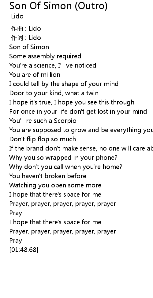 | [01:41.30] | Prayer, prayer, prayer, prayer, prayer |