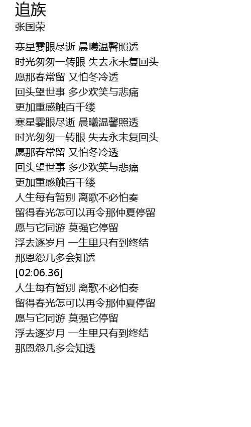 | [02:44.93] | rén shēng měi yǒu zàn bié lí gē bù bì pà zòu |
