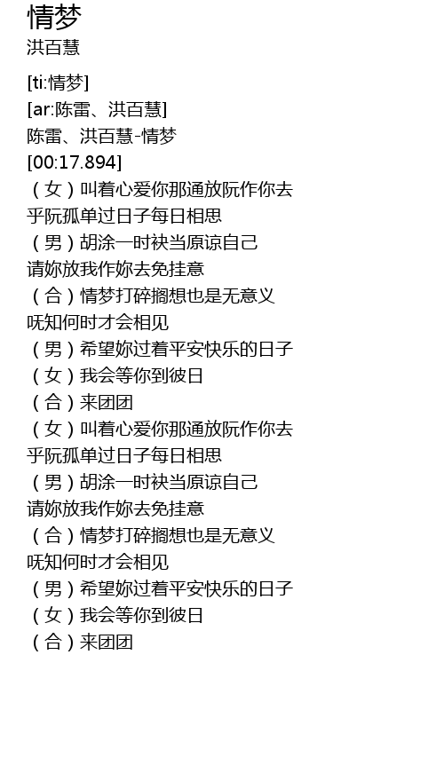 | [00:01.410] | 陈雷、洪百慧-情梦 |