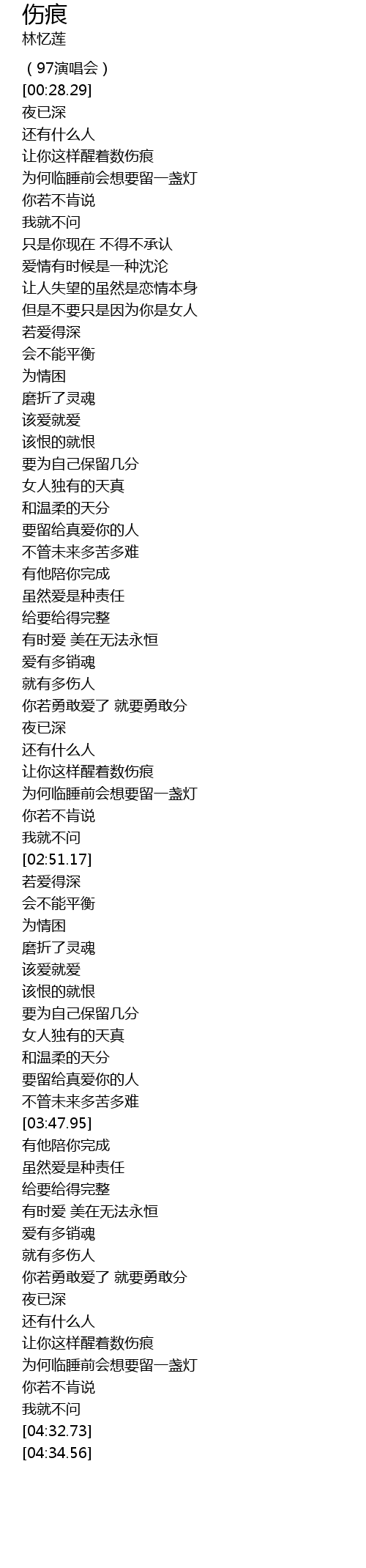 | [04:19.77] | 让你这样醒着数伤痕 |