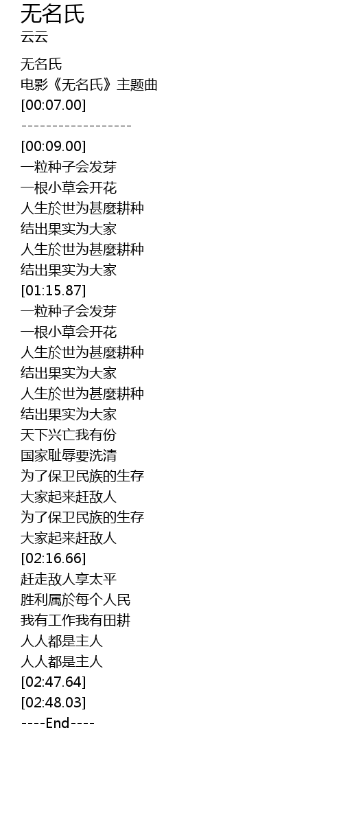 | [00:04.00] | 电影《无名氏》主题曲 |