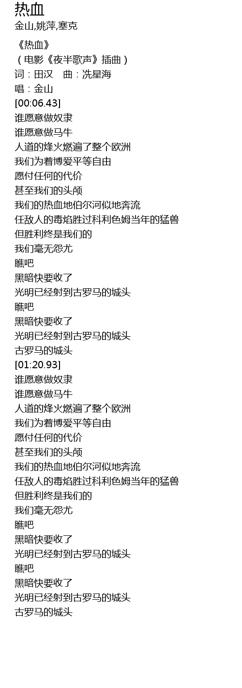 | [00:04.59] | 词:田汉 曲:冼星海 |