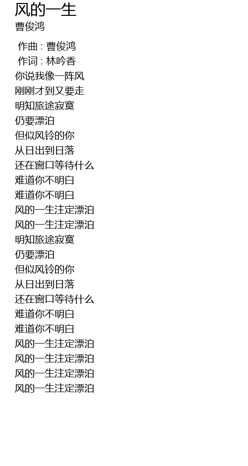 | [01:38.89] | fēng de yī shēng zhù dìng piāo bó |