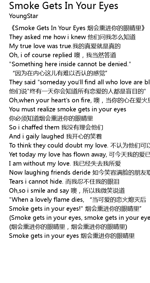 | Smoke gets in your eyes yān huì xūn jìn nǐ de yǎn jīng lǐ |