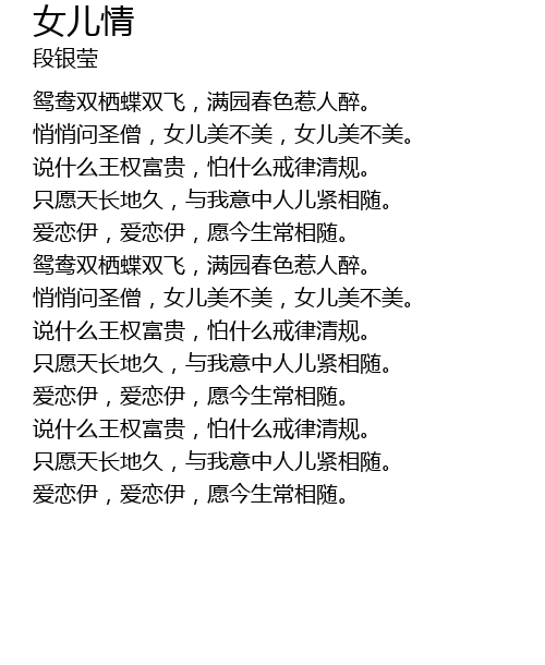| [00:44.480] | qiāo qiāo wèn shèng sēng, nǚ ér měi bù měi, nǚ ér měi bù měi. |