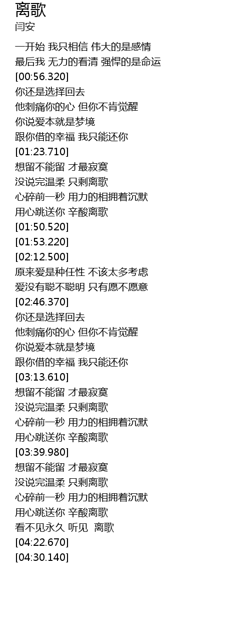 | [03:34.300] | 用心跳送你 辛酸离歌 |