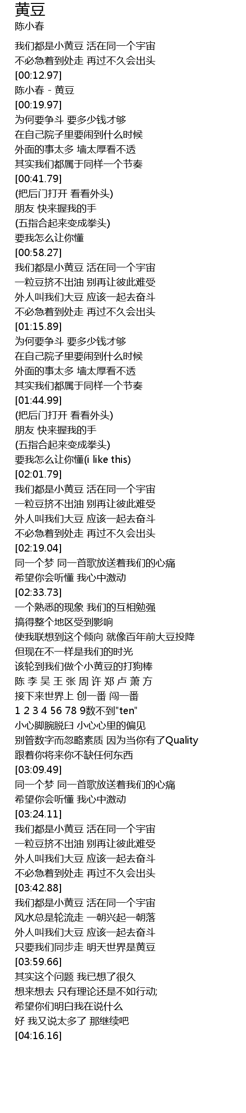 | [03:26.60] | 我们都是小黄豆 活在同一个宇宙 |