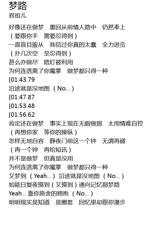 | [02:27.20][01:43.79][00:56.20] | 时常做梦亦梦到 (Yeah...) 沿途就是没地图 (No...) |