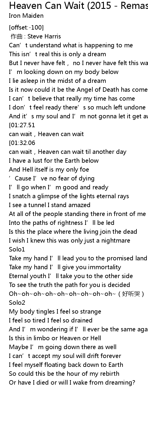 | [01:17.70][01:27.51][02:03.68][02:12.60][05:47.15][05:57.46][06:06.85][06:15.66] | Heaven can wait, Heaven can wait |