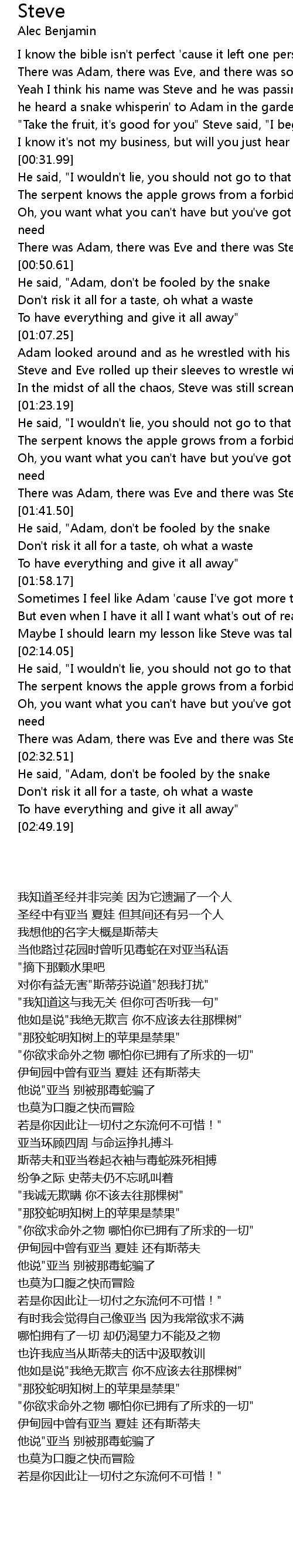Yeah I think his name was Steve and he was passin' through town When he heard a snake whisperin' to Adam in the garden |