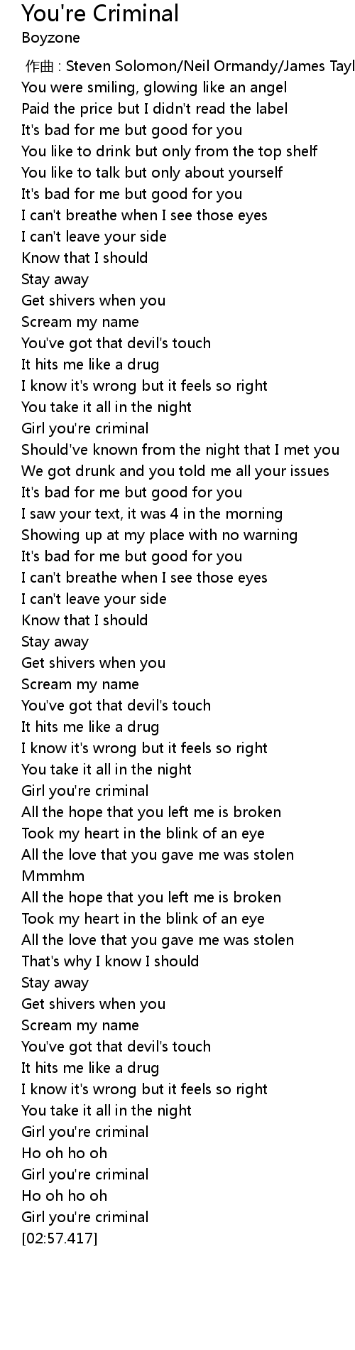 | [02:38.978] | I know it' s wrong but it feels so right |