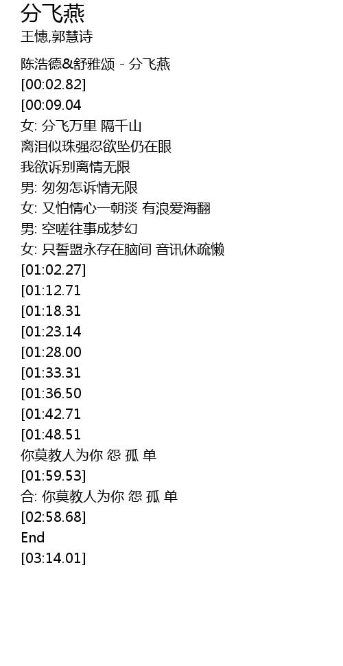 | [00:00.00] | 陈浩德&舒雅颂 - 分飞燕 |