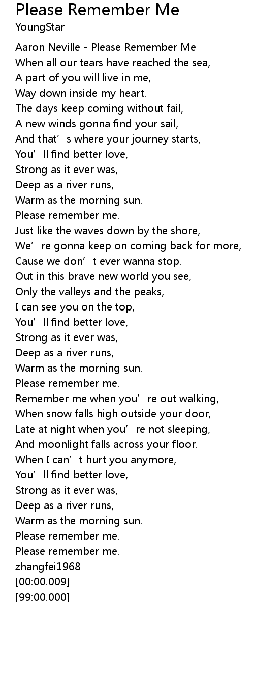 | [00:00.100] | Aaron Neville Please Remember Me |
